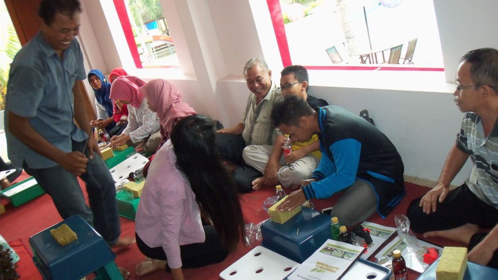 The training started with hydroponics introduction, knowing the types of hydroponics system, practice how to seeding and ends with visiting hydroponics gardens. Every participants got starting kit that contain 1 bucket, 1 hollow styrofoam (the planting hole), 5 pack seeds from different plant (vegetables), 1 rockwool, 5 netpots, 5 flannel fabrics and papers.